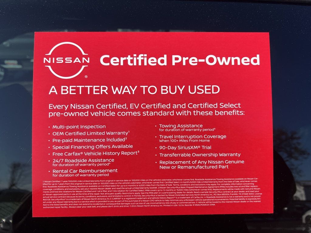 * 7 Year/100,000 Mile Limited Warranty, 24/7 Hour Roadside Assistance, Carfax Vehicle History Report, Plus 1 Year Pre-Paid Maintenance Included. Gas Powered Nissan Models Only.