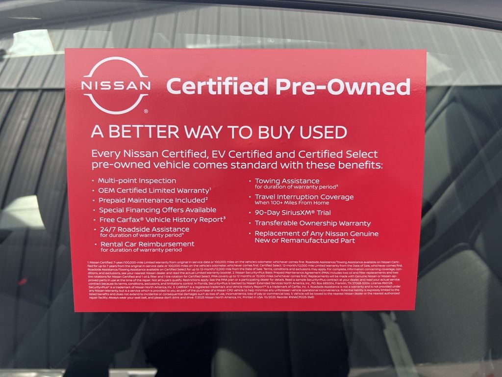 * 7 Year/100,000 Mile Limited Warranty, 24/7 Hour Roadside Assistance, Carfax Vehicle History Report, Plus 1 Year Pre-Paid Maintenance Included. Gas Powered Nissan Models Only.